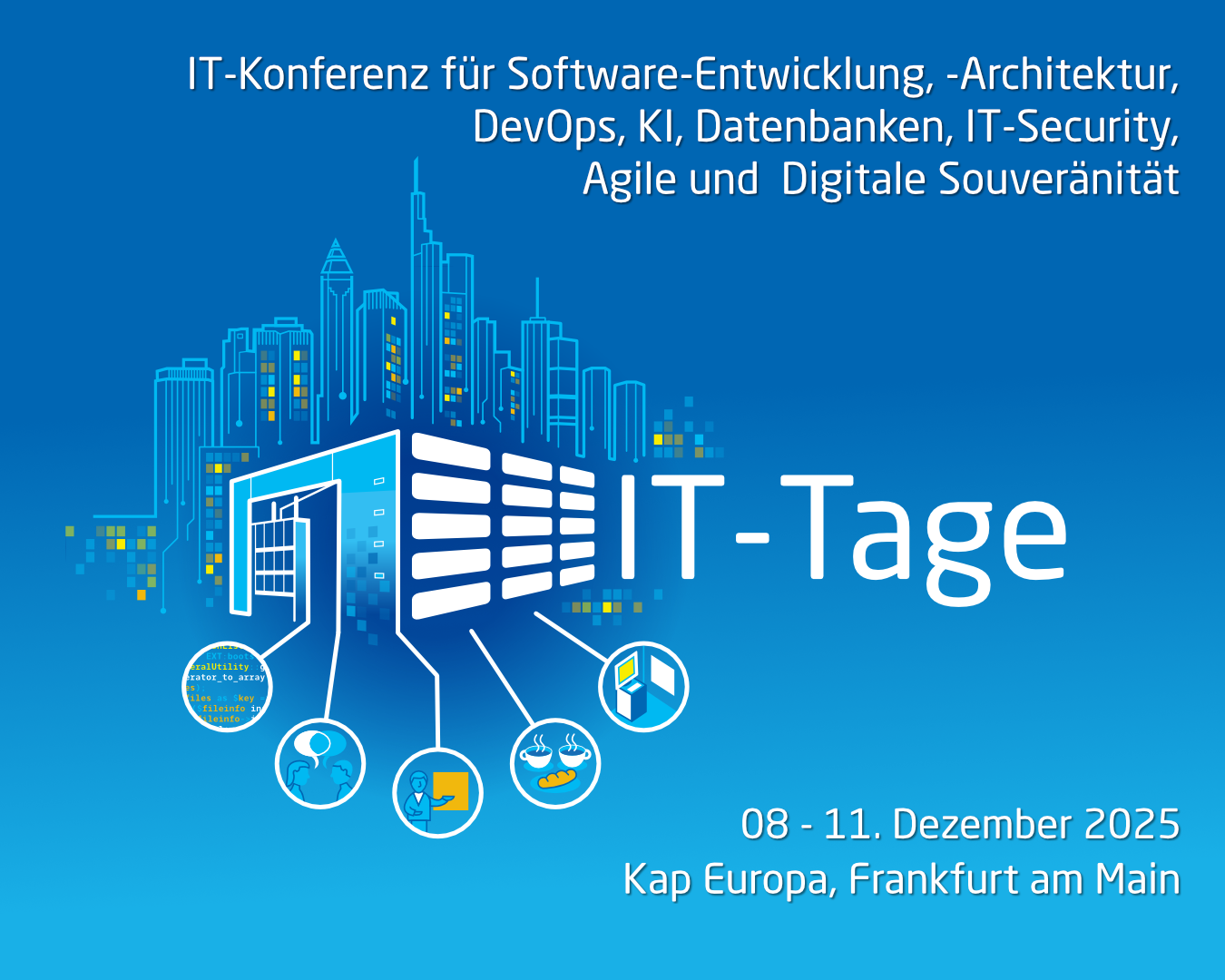 Die IT Tage 2025 finden vom 08.12. – 11.12.2025 in Frankfurt am Main statt. Mehr Informationen zur Veranstaltung und zur Registrierung finden Sie auf der Webseite: https://www.ittage.informatik-aktuell.de/